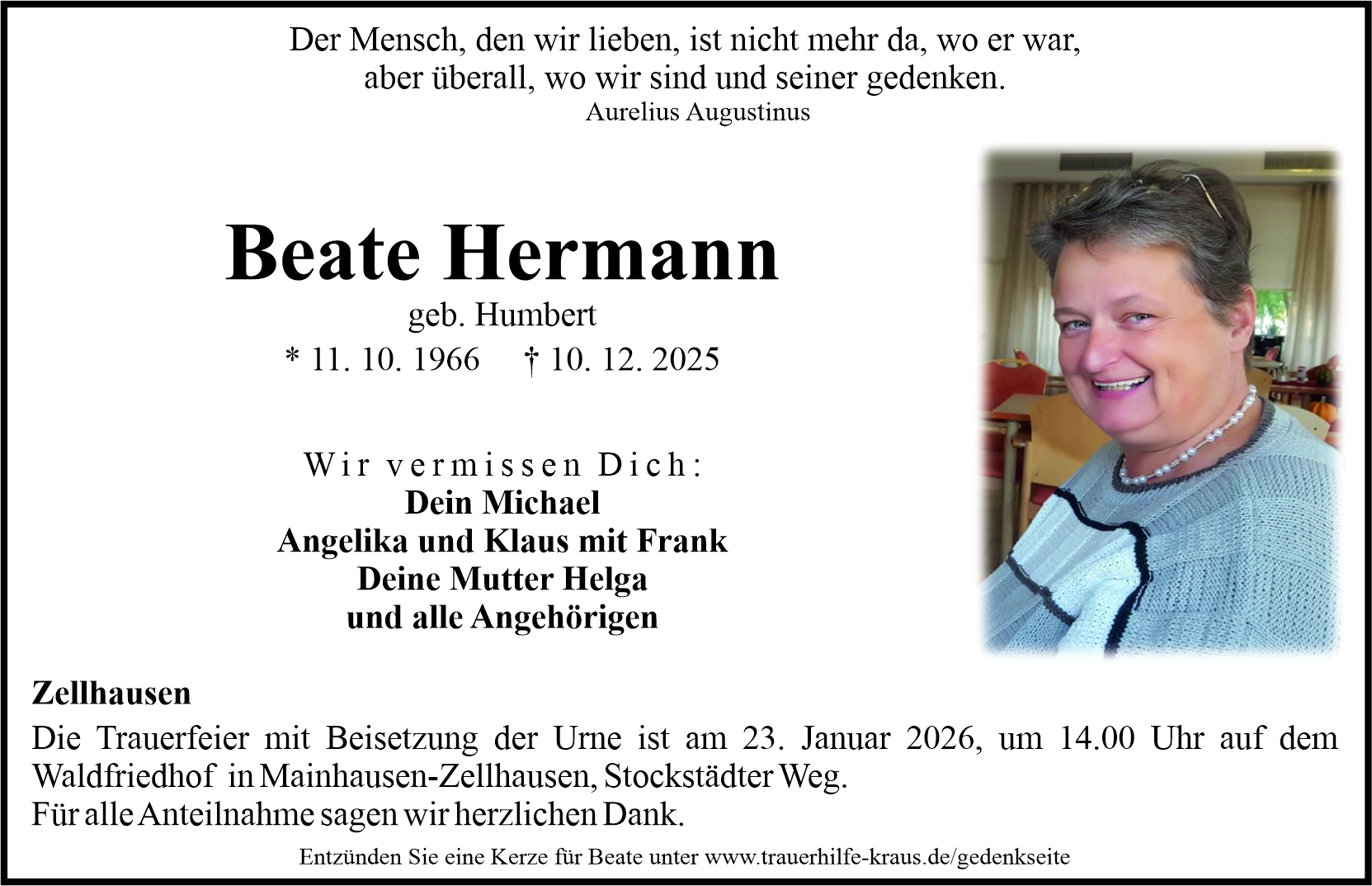 Michael und Sabine Kraus schrieb am 15.12.2025 Liebe Angehörige, in dieser Zeit des Schmerzes wünschen wir Ihnen Kraft, den Verlust im Kreise Ihrer Liebsten zu verarbeiten. Als Zeichen unserer Anteilnahme und des Gedenkens entzünden wir diese erste Kerze. Möge diese Gedenkseite Ihnen helfen, Erinnerungen zu teilen und so das Andenken gemeinsam wachzuhalten. Michael Hermann schrieb am 15.12.2025 Mein lieber Schatz, ich danke Dir für die vielen wundervollen Jahre, die ich an Deiner Seite erleben durfte. Du bist für immer in meinem Herzen und in meinen Gedanken. Ich liebe Dich, Bussi Angelika hermann schrieb am 15.12.2025 Für immer in meinem Herzen Silke schrieb am 15.12.2025 Beate, du fehlst uns sehr. Wir vermissen dich Annett Mewes schrieb am 15.12.2025 Ich möchte Beate mit dieser Kerze in meinem Herzen tragen und den Angehörigen mein Beileid ausdrücken! Christel &Reinhold Schroth schrieb am 15.12.2025 Lieber Michael und Familie wir möchten Euch unser herzliches Beileid aussprechen .Mögen Euch die schönen Erinnerung Kraft schenken.Wir werden die gemeinsamen fröhlichen Feiern mit Beate und Dir nicht vergessen. Liebe Grüße von den Nachbarn Christel &Reinhold Lore Fischer schrieb am 15.12.2025 Ich bin sehr traurig und dankbar für die Jahre, die mich mit Beate verbunden haben. Michael und allen Angehörigen wünsche ich viel Kraft sende meine Aufrichtige Anteilnahme. Mit traurigem Gruß Lore und mein Mann Klaus hernann schrieb am 15.12.2025 Bleibst in meinem Herzen Deine kleine Schwester schrieb am 16.12.2025 Mein wunderbarer tapferer Herzensmensch, ich finde immer noch keine Worte. Ich bin dankbar, dass du Teil meines Lebens warst und immer sein wirst. Michael und Familie, ich fühle mit euch. Fühlt euch gedrückt! Tanja Rautenberg schrieb am 16.12.2025 Schulzeit, beste Zeit mit dir, denke oft daran. Familie Jung schrieb am 16.12.2025 Du fehlst! Du warst ein Mensch mit so viel Herzenswärme für alle – das macht dich unvergessen. Wir sind sehr dankbar, dich kennengelernt zu haben. Karola und Martin Böckmann schrieb am 16.12.2025 Wir sind sehr dankbar, dass du die vielen Jahre ein Teil unserer Familie warst. Vielen Dank für viele schöne Momente. Du bleibst immer in unseren Herzen Jürgen Kröner schrieb am 16.12.2025 Danke Beate! Du hast uns an die Hand genommen, als alles neu für uns war. Wir vermissen dich! Helga Idel schrieb am 16.12.2025 Du fehlst sehr. Aber ich bin Dankbar, das Du meinem Leben als Freundin und Kollegin bereichert hast. Du wirst immer in meinem Herz und in meinen Gedanken sein. Mein Beileid an Michael und deine Familie, ich wünsche Ihnen viel Kraft in dieser schweren Zeit. Doris Reuther schrieb am 16.12.2025 Lieber Michael und Familie, herzliches Beileid für euren schmerzlichen Verlust. Beate war so ein fröhlicher und herzensguter Mensch. Wir werden sie sehr vermissen. Die Erde weint, aber der Himmel freut sich, da nun ein Engel geboren wurde. Mike Schöffel schrieb am 16.12.2025 Unser aufrichtiges Beileid und Mitgefühl übermitteln wir allen Familienangehörigen und Freunden. Beate, Du hat uns stets viel Sonne und Fröhlichkeit geschenkt. In unseren Erinnerungen werden wir immer mit einem Lächeln an Dich denken. Jens Bethke schrieb am 16.12.2025 Beate, Du warst über so viele Jahre eine wunderbare Kollegin und ein wahnsinnig positiver Mensch. Es tut mir unendlich leid, dass Du viel zu früh von Deinem Mann, Deinen Angehörigen und allen die Dich geliebt haben, gegangen bist. Du bleibst unvergessen. Katja Krieger schrieb am 16.12.2025 Dankbar für den schönen Nachmittag, den wir noch zusammen haben durften. Mein Beileid an Michael und allen Angehörigen. Ich werde dich in liebevoller Erinnerung behalten. Petra Kollmann schrieb am 16.12.2025 Liebe Beate, du fehlst mir und ich bin sehr traurig. Ich bin aber auch sehr dankbar für all die gemeinsamen Jahre der Freundschaft, für unsere Gespräche und das Lachen, das wir geteilt haben. Deine herzliche, fröhliche Art und deine Zuversicht haben mich so oft getragen – all das wird für immer einen festen Platz in meinem Herzen haben. Lieber Michael, ich wünsche dir von Herzen viel Kraft, Trost und liebe Menschen an deiner Seite in dieser so schweren Zeit. Stefan Gebhardt schrieb am 16.12.2025 Ich bin dankbar für die vielen schönen Jahre, die wir gemeinsam verbringen durften und werde dich als wunderbaren Menschen in Erinnerung behalten. Michaela schrieb am 17.12.2025 Auch wenn ich dich nur kurz kennenlernen durfte, fand ich es immer sehr angenehm Zeit mit dir zu verbringen! Die Nachricht des Todes hat mich sehr getroffen. Du warst immer fröhlich und freundlich und hattest für alles Verständnis. Mein aufrichtiges Beileid all deinen zurückgebliebenen Angehörigen. Hans Jürgen und Gabi schrieb am 18.12.2025 Du wirst immer in unserem Herzen bleiben. Fröhlich hilfsbereit und immer hattest du ein offenes Ohr für jeden. Wir sind sehr traurig. Unser aufrichtiges Beileid an alle Hinterbliebenen. In ewiger Freundschaft Hans Jürgen und Gabi Maja schrieb am 18.12.2025 Du hast so viel Licht in unser Leben gebracht. Du fehlst. Mein herzliches Beileid und viel Kraft für alle, die um sie trauern.