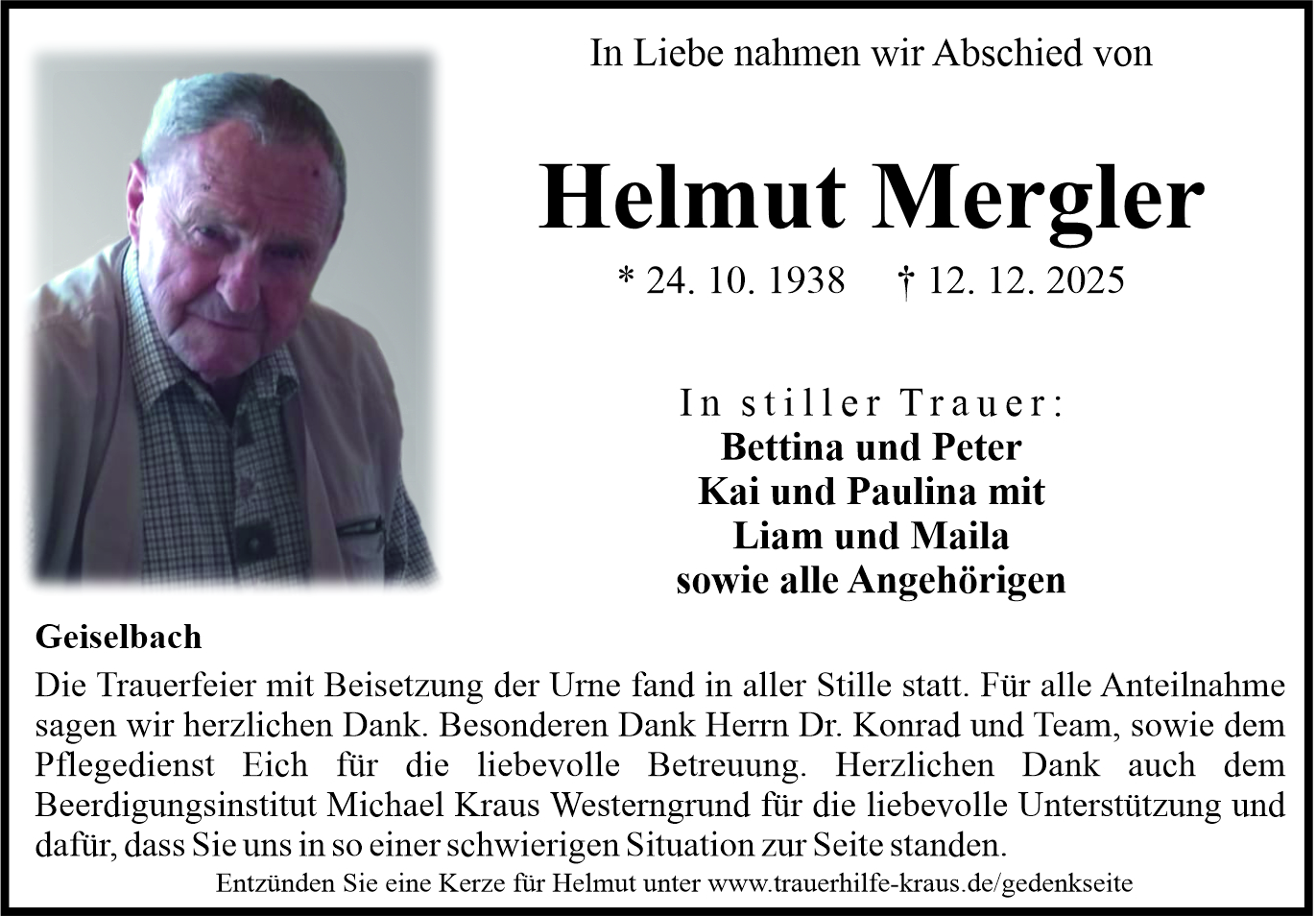 Michael Kraus und Sabine Kraus schrieb am 21.12.2017 Der Familie gilt unsere herzliche Anteilnahme